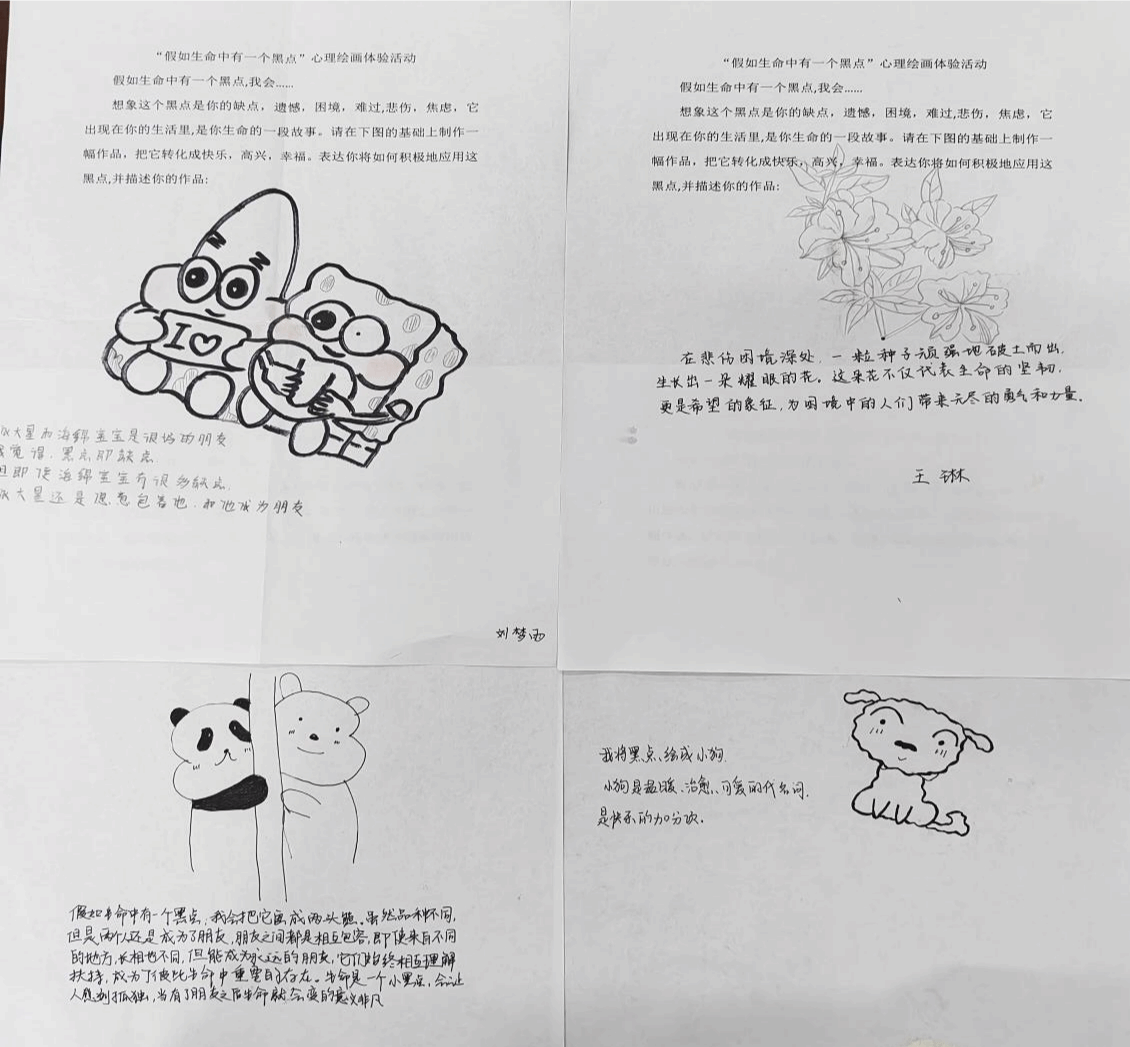 最后一个环节是情绪心理画体验,以“生命中的黑点”为主题。空白的纸上有一个黑点,它可能代表着我们人生旅程中的一个经历或者挫折,同学们可根据自己的所思所想所悟,对这个小黑点进行创作与润色,同学们纷纷发挥奇特的想象,结合自己的日常生活,把积极心态与艺术创作紧密相连,创作了一幅幅有意思的心理绘画。