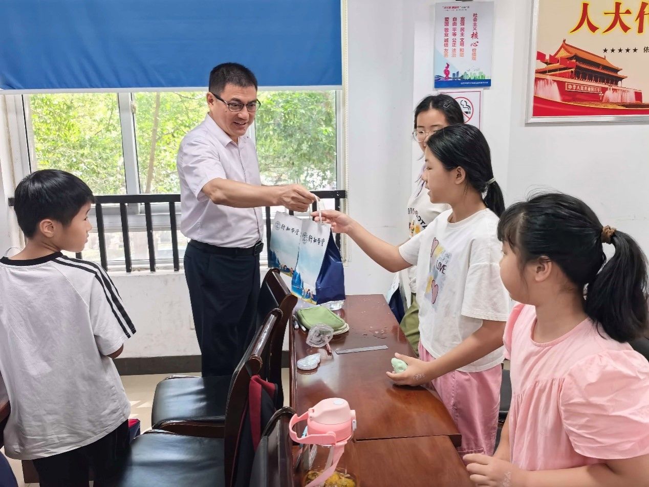 周端明深入课堂,与正在进行手工活动的小学员们亲切互动。他仔细欣赏孩子们的手工作品,聆听小学员们对作品讲出的奇思妙想。走访期间,周端明代表学校为小学员们送上了精心准备的礼品,并祝福他们有个美好快乐的七彩假期。