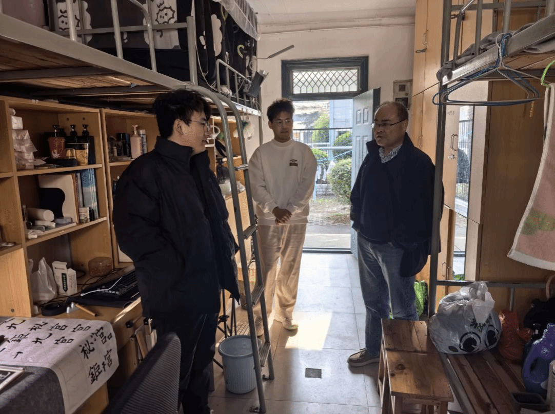 走访中,学院领导细查宿舍卫生内务、物品规范摆放,紧盯违规电器使用、电线安全等核心隐患,现场交办整改、明确要求,重申 “安全是育人底线”,督促学生增强安全意识、严守管理规定。同时,学院领导与学子面对面畅谈,深入了解住宿体验、学业进展与发展规划,从生活保障到思想引领双向发力:生活上,叮嘱学子做好冬季防寒、保持宿舍通风,凝聚互助友爱的集体合力;思想上,鼓励学子珍惜同窗时光,涵养包容协作品格,树立正确价值观,在勤学笃行中勇担使命、争当先锋。