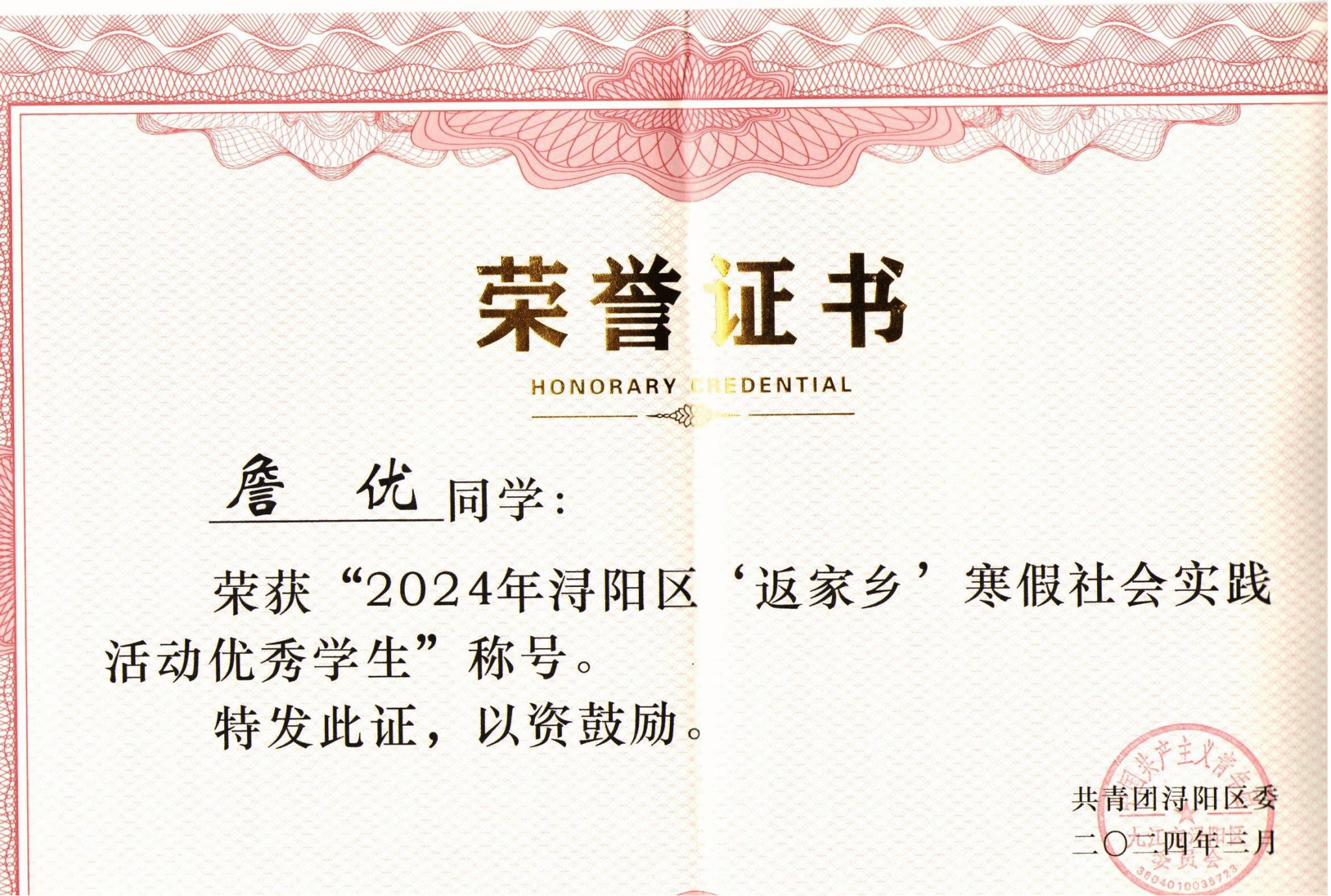 2022级经济统计学专业学生詹优工作认真、踏实肯干,受到共青团九江市浔阳区委表扬,并获评浔阳区“返家乡”社会实践活动优秀学生。