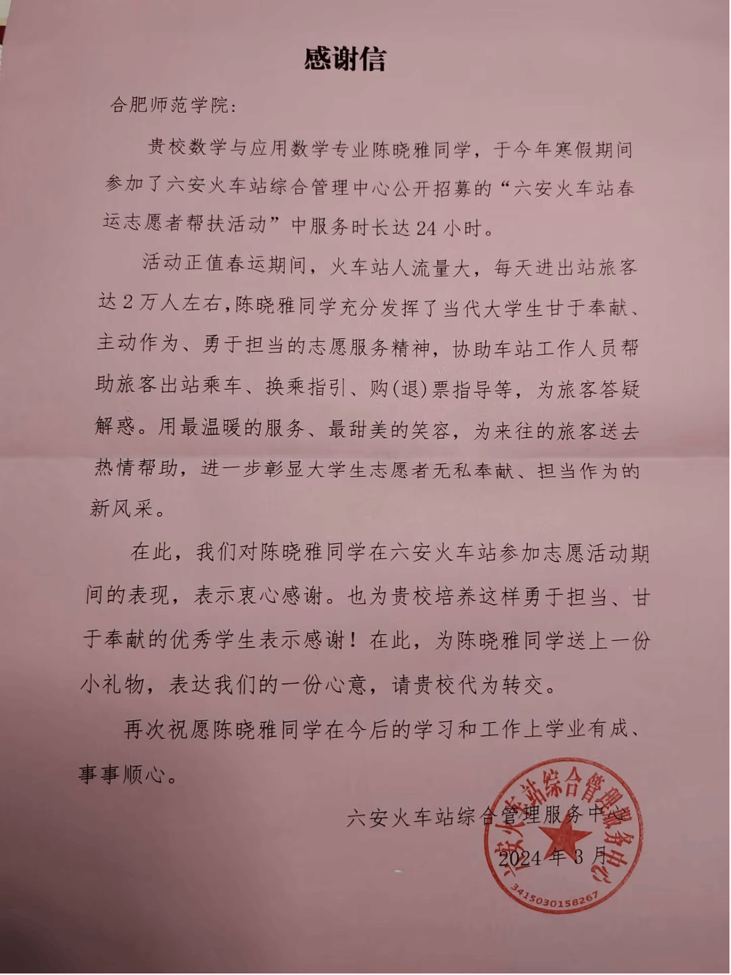 2023级数学与应用数学专业学生陈晓雅积极参加了2024年六安火车站春运志愿者帮扶活动,六安火车站综合管理服务中心发来感谢信,对陈晓雅工作中突出表现和甘于奉献、勇于担当的精神给予肯定,为学校对于青年学子的培养表示诚挚感谢!