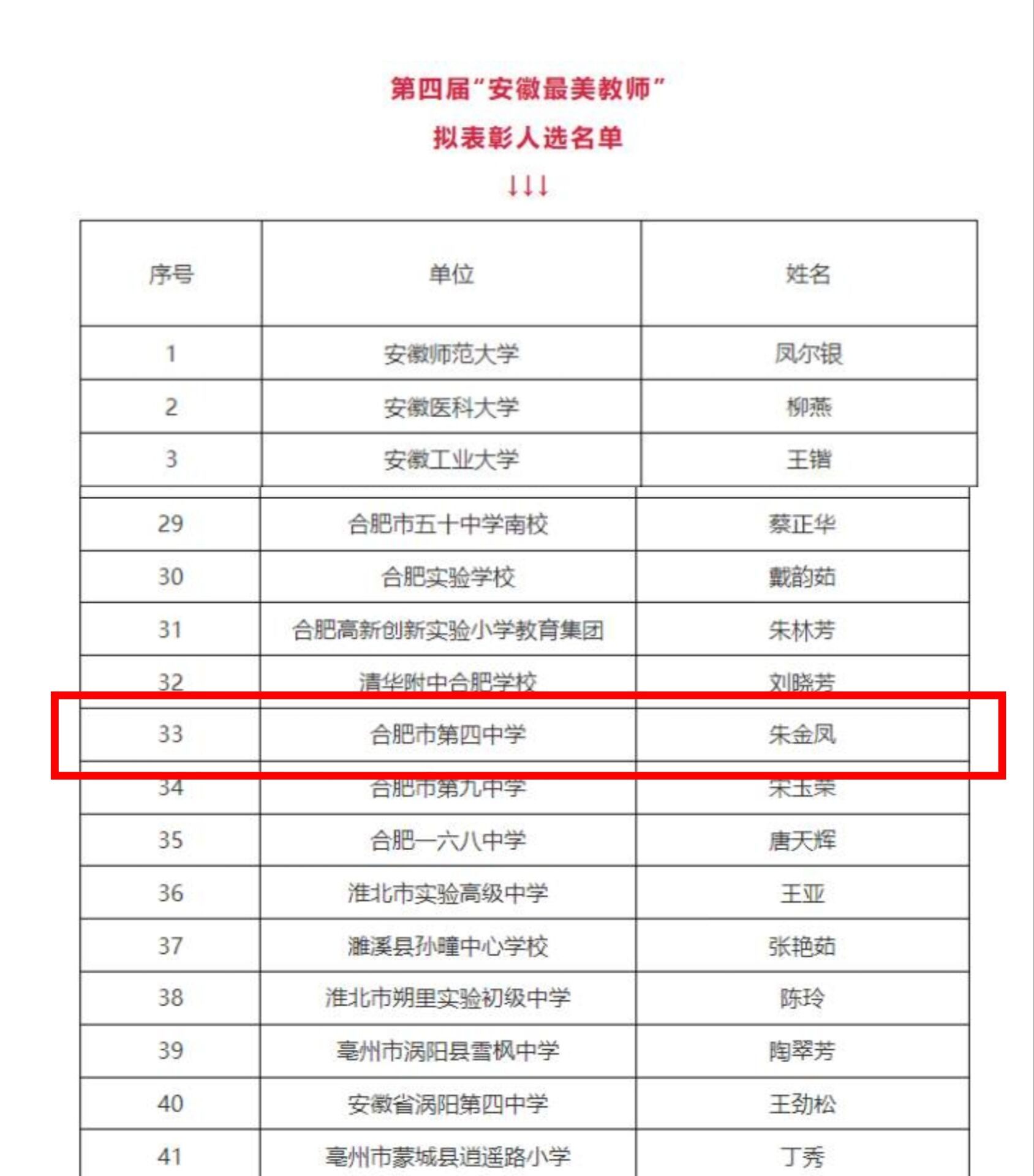8月31日,根据安徽省教育厅对“2023年安徽省中小学十佳班主任、优秀班主任和第四届安徽最美教师拟表彰人选”的公示,我院2016届数学教育硕士专业校友、合肥四中教师朱金凤名列其中。