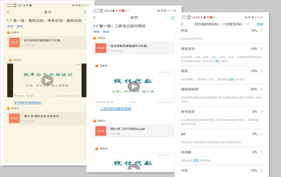 (3)资源丰富化。经过充分讨论、反复比较,课程组确定使用四川大学徐小湛教授录制的课程教学视频,该视频不仅内容和我校使用的教材完全配套,而且每一节还有相应的考研例题选讲,可做长久使用。在设置中,按每周内容把教学视频、视频对应的网址、PDF文件都加入到课程章节里了,同时考虑到学生没有教材,我还在资料里上传了电子书和PPT,并分配了学习任务,设置各种成绩权重。