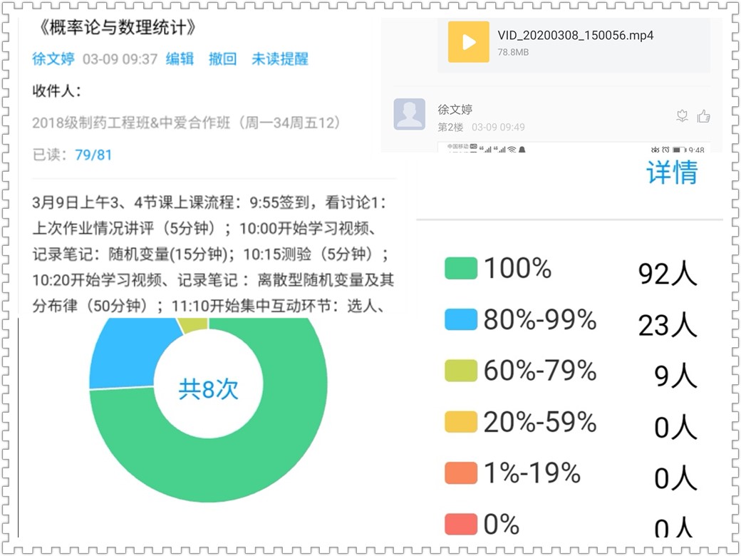 对于教学视频内容较多的章节,比如第二章第二节离散型随机变量及其分布律,视频时长45分30秒,我会给学生留出50分钟左右的完整时间段进行学习,中间不插入互动,确保他们有一个完整的学习、思考和做笔记的过程。这一时间段,我会一直关注学生观看视频的进度情况,如果发现有没有学习的情况,会立即@提醒。