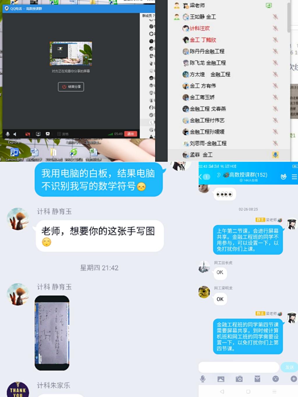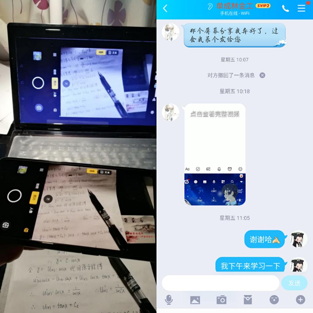 平时上课,习惯了一支粉笔三尺讲台,一个又一个知识点,有条不紊的写在黑板上。而线上教学,尤其是讲解题目,不能板书怎么办?我就采取了一种比较笨的方法,在纸上写,边写边讲,同时用手机录制,然后传到课程里或者QQ群,供学生学习。同时,也发动学生的智慧,帮助我解决授课中的问题,如学生就教会了我如何使用幕享实现板书功能。