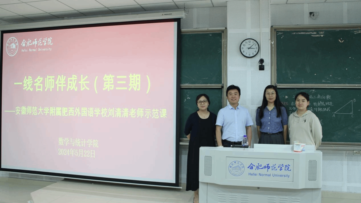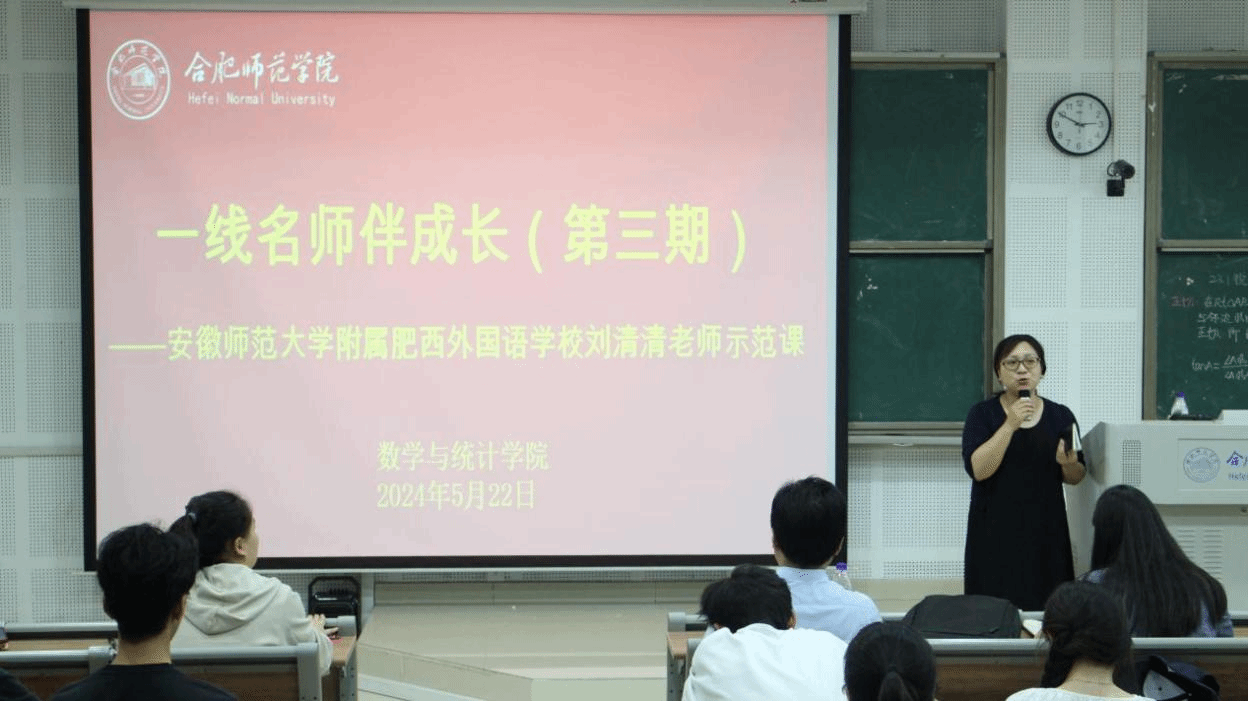 为落实“学生中心”理念,提升数学师范生教学技能,做好省级、校级师范生教学技能竞赛赛前辅导,5月22日下午,AC米兰中文官方网站在滨湖校区博学楼A108教室举办了“一线名师伴成长”第三期活动。此次活动邀请了合肥市金牌职工、合肥市教坛新星、合肥市优质课一等奖获得者、肥西县初中数学名师工作室领衔人、安徽师范大学附属肥西外国语学校的刘清清老师为数学专业师范生上了一堂初中数学示范课,并做了师范生教学技能辅导讲座。AC米兰中文官方网站副院长黄浩、数学课程与教学论教师栾庆芳、辅导员刘全亚,2022级、2023级共278位数学与应用数学(师范)专业的学生参加了本次活动,活动由副院长黄浩主持。