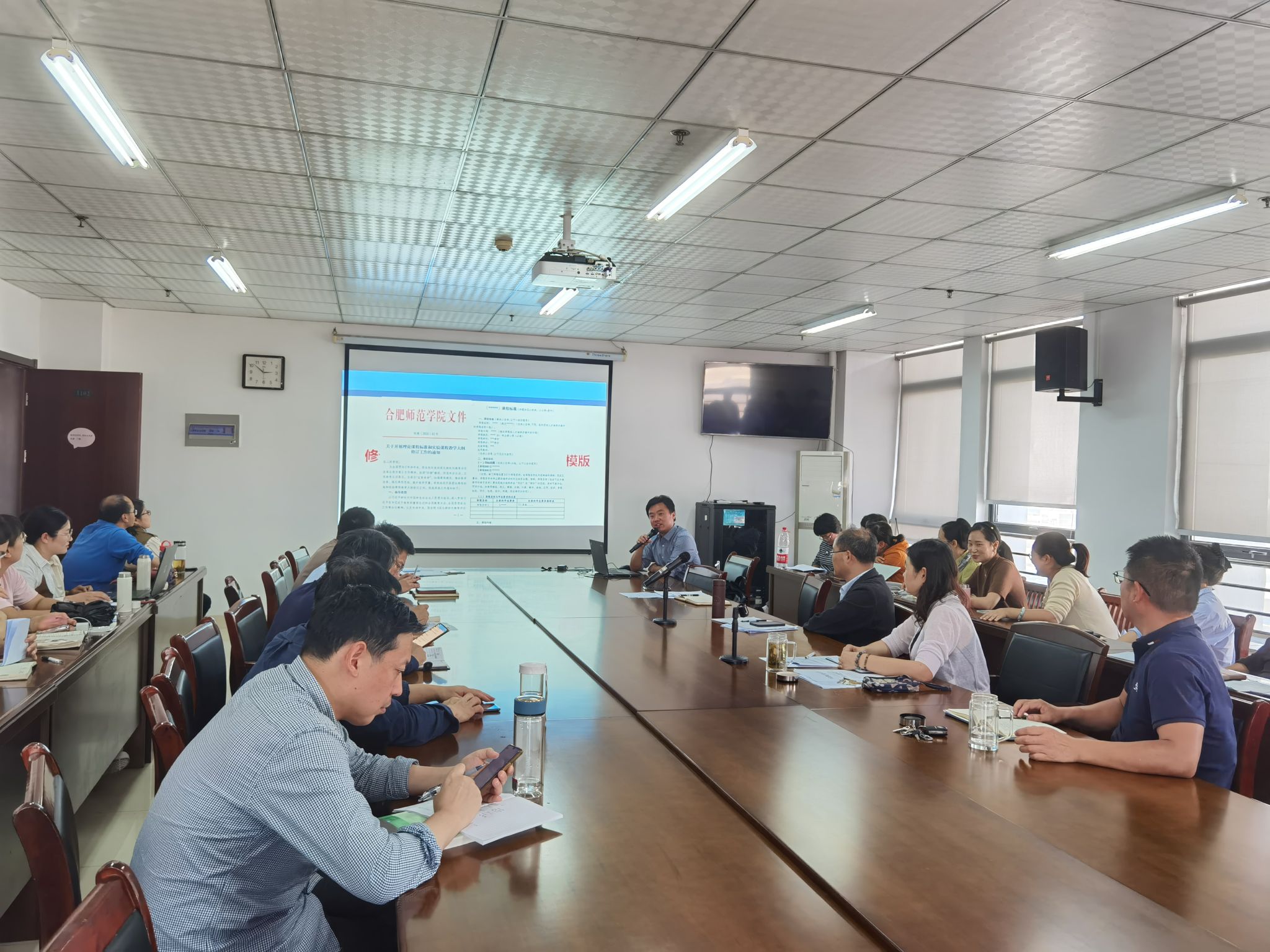 随后,副院长黄浩就课程标准修订工作进行了布置安排,并作了题为《新一轮课标修订文件解读与工作安排》的工作报告。黄浩从“为何修?”“修什么?”“ 谁来修?”“何时修?”四个方面进行了解读与介绍。他强调,新一轮课程标准的修订最重要的就是要坚持立德树人根本任务,落实“学生中心、产出导向、持续改进”的教育理念。报告中,他结合高教改革新趋势以及审核评估指标体系内涵解释,说明了新一轮课标修订的背景,并详细分析了在课标修订过程中如何做到“反向设计”与“正向施工”,对于如何贯彻“学生中心”和“产出导向”也进行了细致的分析与讲解,强调了课程思政融入、学生能力可评可测、教学内容的更新以及优化过程性考核环节的重要性。最后,他结合课程组组建情况明确了课标修订的任务分工和具体时间节点,希望所有老师齐心协力,按时高质量完成课标修订工作。