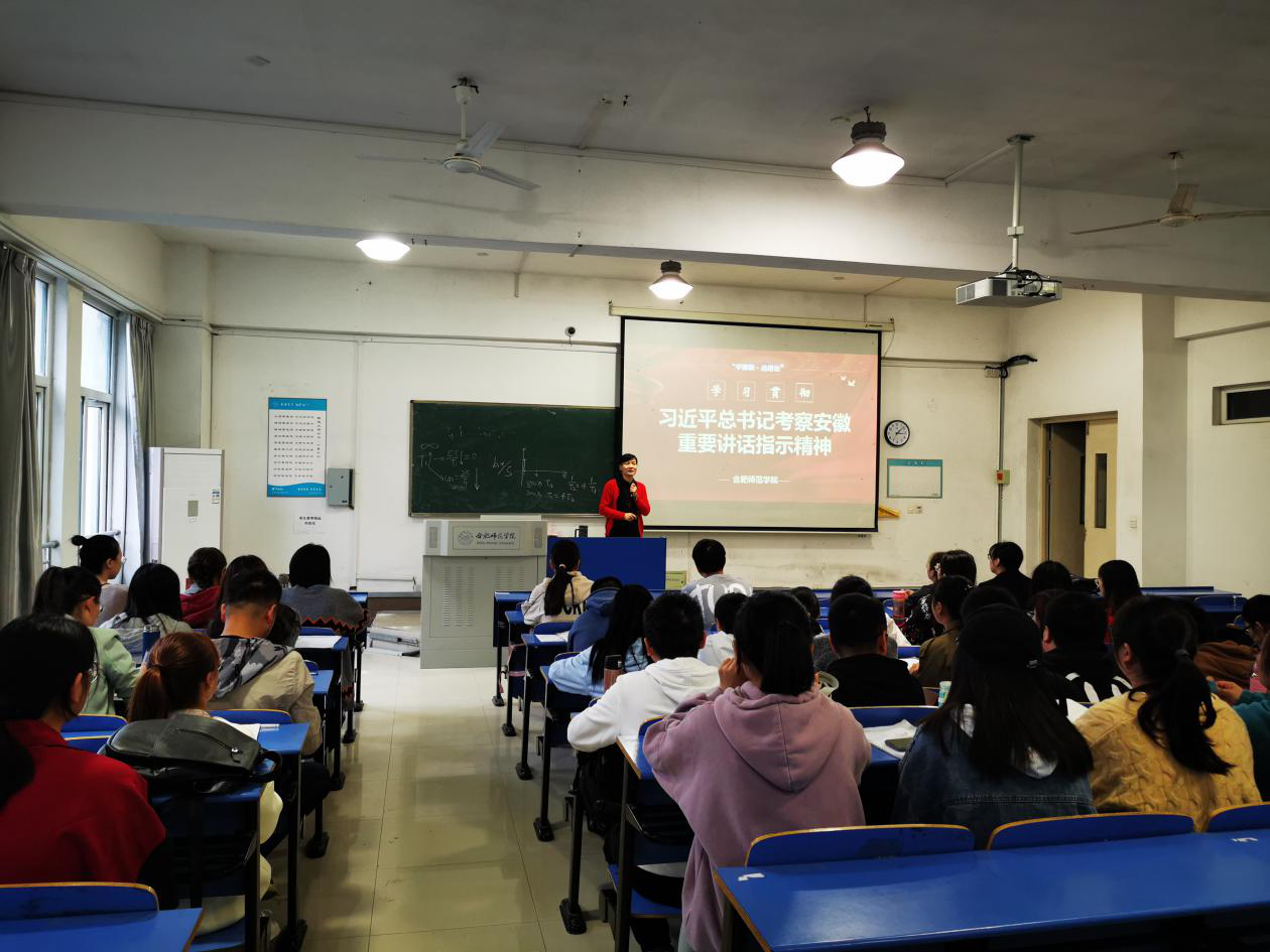 首先,郑支农带领同学们学习了解习近平总书记在安徽的考察路线、调研内容和重要讲话指示精神,希望全体党员要充分认识习近平总书记考察安徽重要讲话指示精神的重大意义。同时指出要全面把握在习近平总书记2016年视察安徽重要讲话精神指引下美好安徽建设取得的新成就,深刻领会习近平总书记考察安徽重要讲话指示精神的丰富内涵,切实推动习近平总书记考察安徽重要讲话指示精神落地生根。在党课中,郑支农反复强调学习好、宣传好、贯彻好习近平总书记考察安徽重要讲话指示精神,是当前和今后一个时期学院的重大政治任务。同时,她结合学院学生党支部党建工作实际,对学生党支部如何推进“大学习、大宣传、大贯彻”习近平总书记考察安徽重要讲话指示精神提出了建议,对学生党员如何在学习、成长成才、就业等方面起模范带头作用提出了希望。