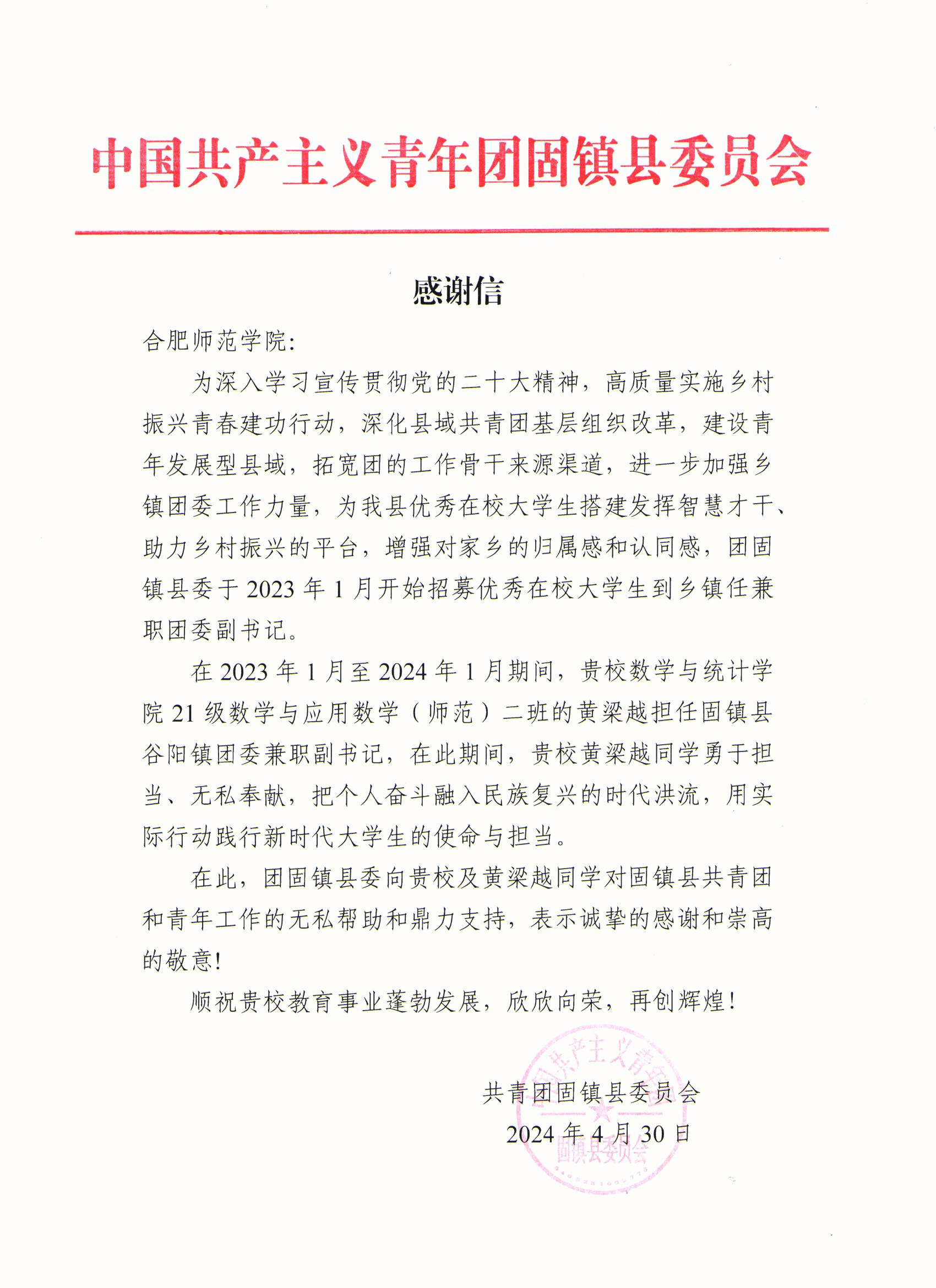 近日,学校收到共青团固镇县委员会发来的感谢信,对学校AC米兰中文官方网站2021级数学与应用数学(师范)2班黄梁越同学在担任固镇县谷阳镇兼职副书记期间的良好表现给予了高度赞扬,并由衷地感谢学校对固镇县共青团及青年工作的帮助与支持。