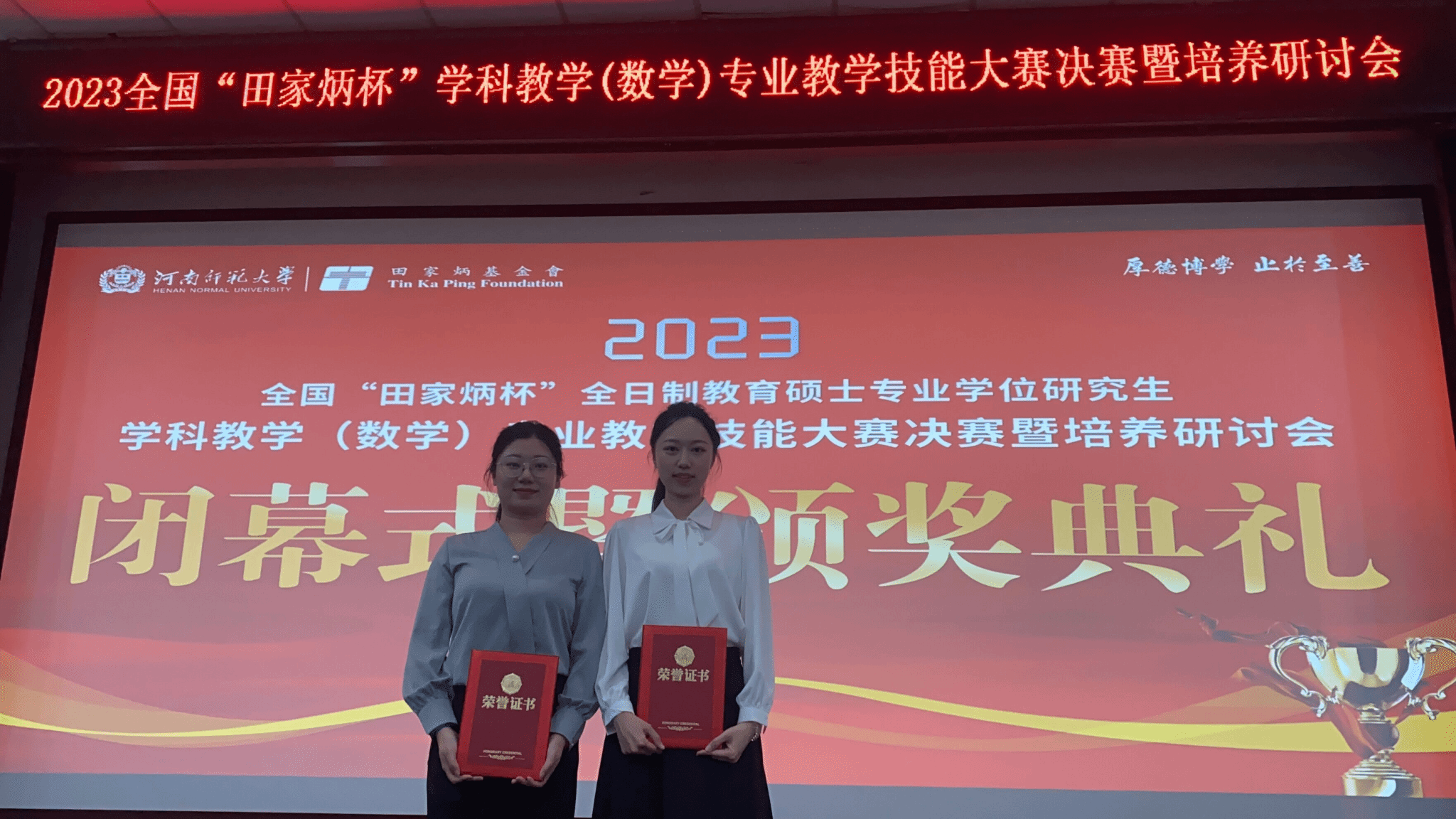 10月29日,2023年全国“田家炳杯”全日制教育硕士专业学位研究生学科教学(数学)技能大赛决赛在河南师范大学圆满落下帷幕。AC米兰中文官方网站2022级学科教学(数学)专业硕士研究生姜悦宁、刘舒妍、曾绮雯在决赛中不畏强手,奋勇拼搏,取得优异成绩,其中姜悦宁同学获得全国一等奖,刘舒妍同学获得全国二等奖,曾绮雯同学获得优秀教学设计奖。