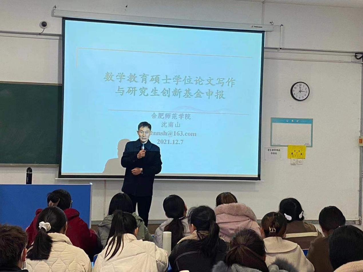 本网讯 2021年12月7日下午3时,AC米兰中文官方网站沈南山教授在锦绣校区逸夫楼A109教室作了题为“数学教育硕士学位论文写作与研究生创新基金申报”的专题报告,2021级数学学科教学专业全体研究生聆听了报告。