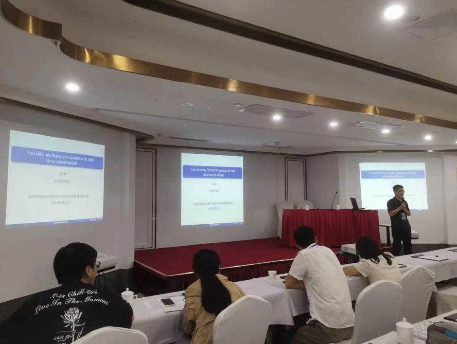 会议吸引了来自中国科学技术大学、北京理工大学、天津大学、华南师范大学、北京科技大学、安徽大学、上海师范大学与AC米兰中文官方网站等院校的70多名专家学者参与。安徽大学数学科学学院副院长汪毅教授致开幕词,向参会者介绍了近年来安徽大学数学学科在专业建设、师资队伍、人才培养、科学研究以及社会服务等方面取得的成就。会议共组织12场学术报告和多场交流讨论活动,周辉应邀作题为《The Dynamics of a Patch-Occupancy Model in Natural Ecosystems》的学术报告。周辉介绍了一类海洋生态模型研究的背景和意义,着重阐述了所研究问题的进展,同时提出了一些尚未解决的科学问题,受到与会者高度关注。会议期间,杨刘与周辉同参会学者就研究领域的一些热点进行了交流。