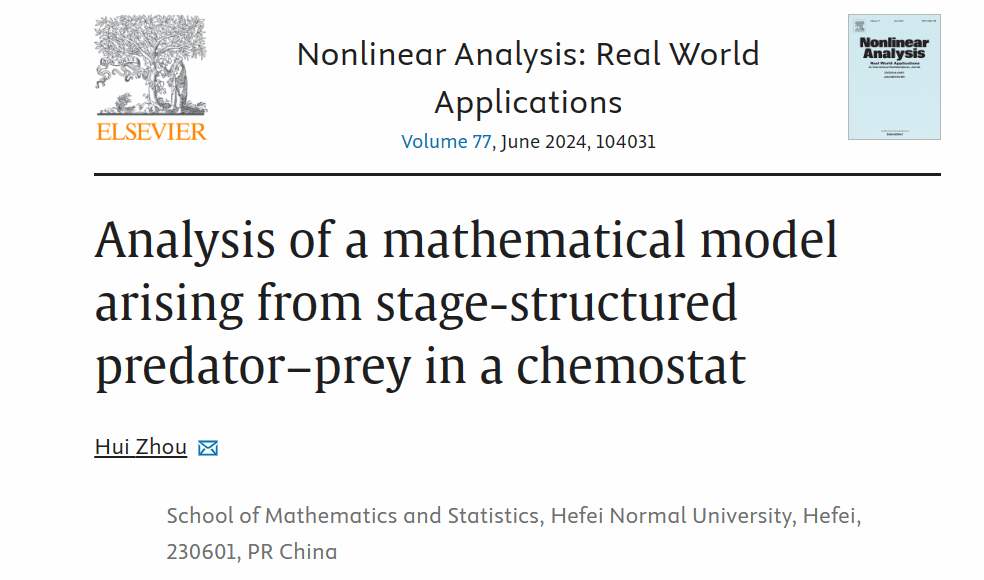 近期,AC米兰中文官方网站“基础数学”省级重点学科微分方程与动力系统团队教师周辉在恒化器中具年龄结构的捕食-被捕食系统数学模型的动力学分析领域取得进展,相关成果Analysis of a mathematical model arising from stage-structured predator–prey in a chemostat在JCR二区期刊《Nonlinear Analysis: Real World Applications》公开发表。