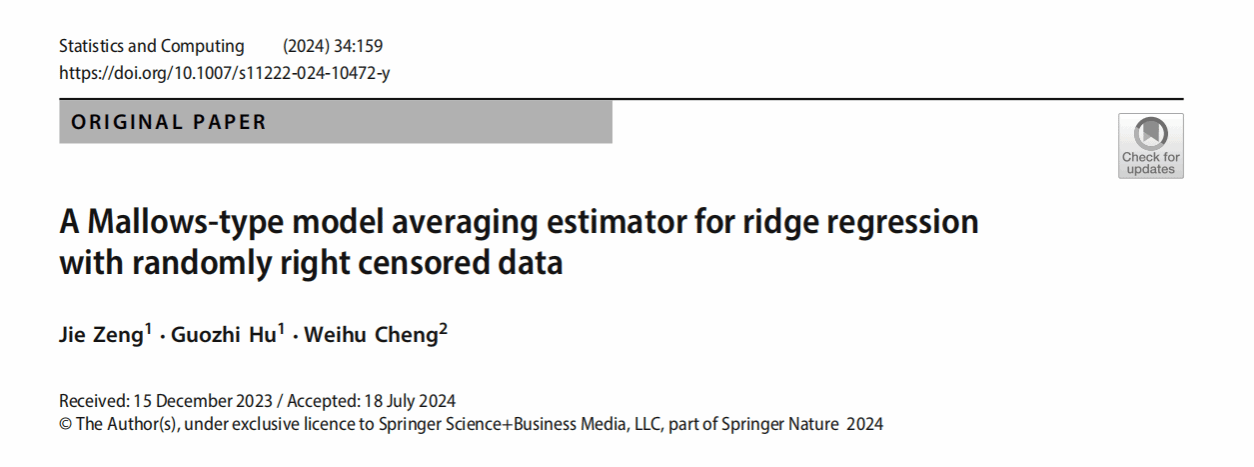 近期,AC米兰中文官方网站“基础数学”安徽省重点学科应用统计与分析团队博士曾婕、胡国治在最优模型平均领域取得进展,相关成果A Mallows-type model averaging estimator for ridge regression with randomly right censored data在统计学权威期刊《Statistics and Computing》(中科院二区、JCR一区)上公开发表。