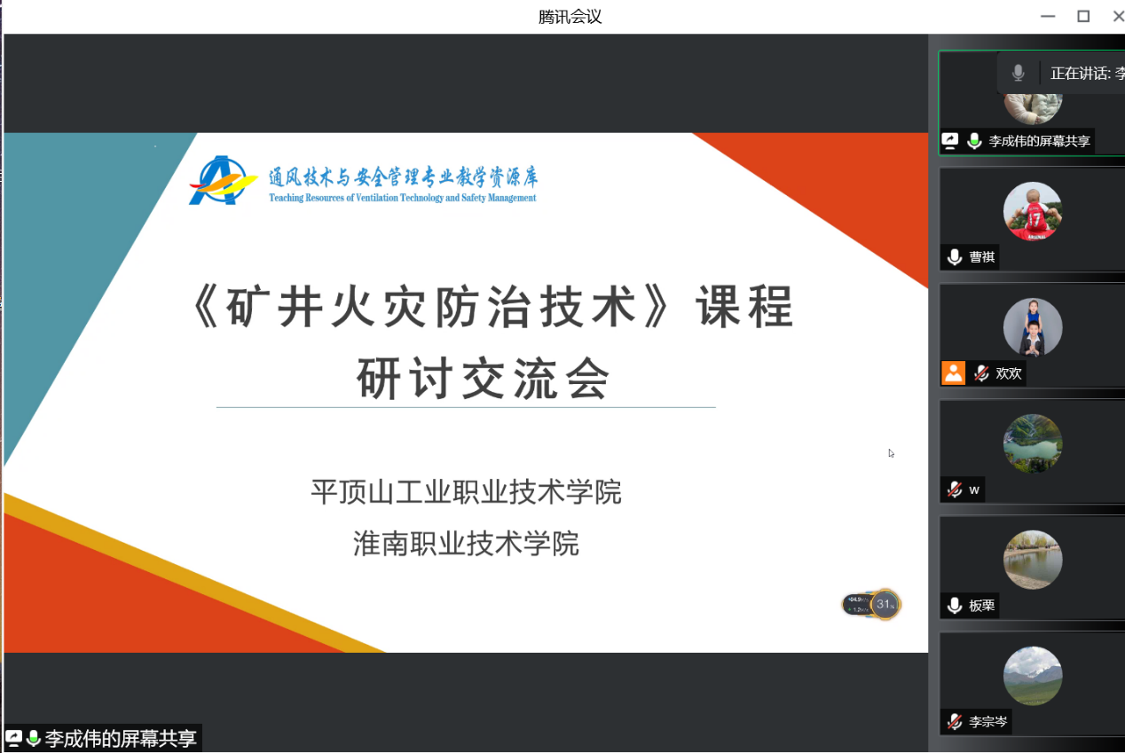 6月2日,通风技术与安全管理专业国家级资源库《矿井火灾防治技术》课程建设研讨会在腾讯会议平台行。平顶山工业职业技术学院资源开发学院院长徐从清出席会议,通风技术与安全管理专业教学资源库建设相关人员,葡京8883官网入口矿井火灾防治技术课程建设成员汪佑武、曹祺、柴永兴参加会议。