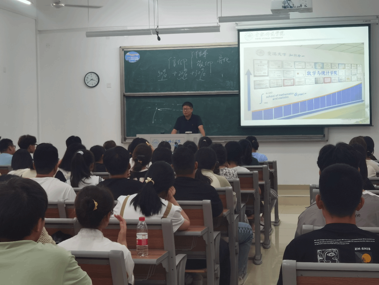 数学系主任许和乾向同学们介绍了数学与应用数学(师范)专业的优势特色和师资力量,分别从专业概况、专业发展、如何学好专业课、就业导向等方面为同学们进行了详细讲解。他希望同学们按照习近平总书记对一名好老师的要求,设定学习新目标,扎实学好专业知识,积极实践,提升师范生技能,毕业时能够成为党和人民满意的“四有”好老师。