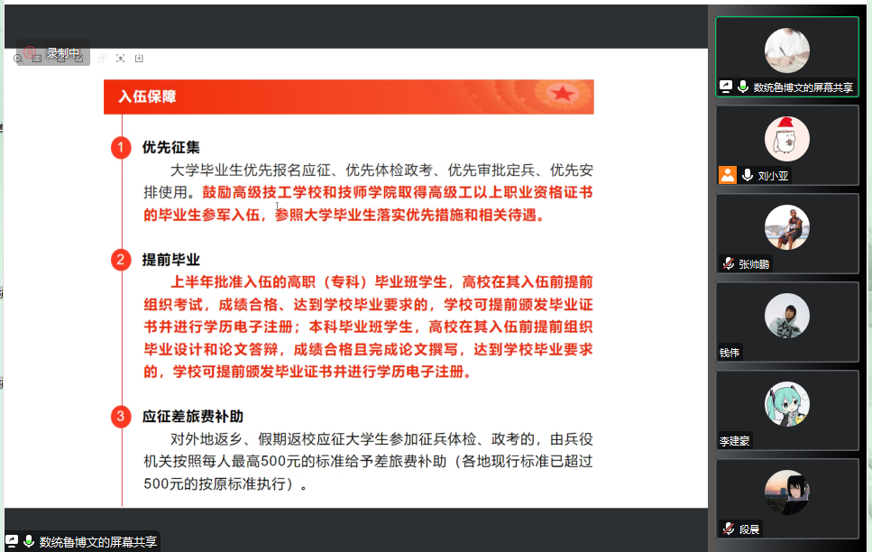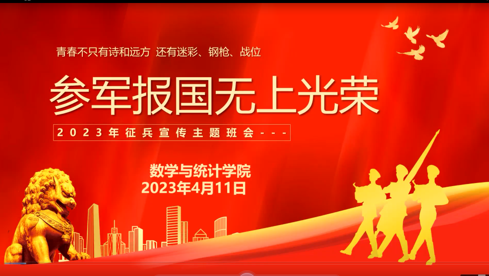 4月11日晚上,数学与与统计学院开展2023年入伍政策云宣讲会,2023届部分毕业生参加,会议邀请了退伍复学学生鲁博文,会议由辅导员刘全亚主持。