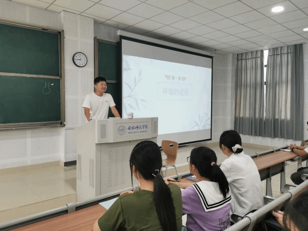 为了帮助新生更好地融入大学生活,适应大学生活。学生处韦小龙以《幸福合师,从心出发》为题,为新生普及了大学中常见的心理问题和调适的主要方法;辅导员周倩结合愿景计划,以《你好,大学》为题全面系统地介绍了大学学习、生活、健康等方面;校大学生自律委员会的同学也从贴近学生生活的学生角度,从自然环境、学习环境等方面为同学们做了大学生活适应的指导。