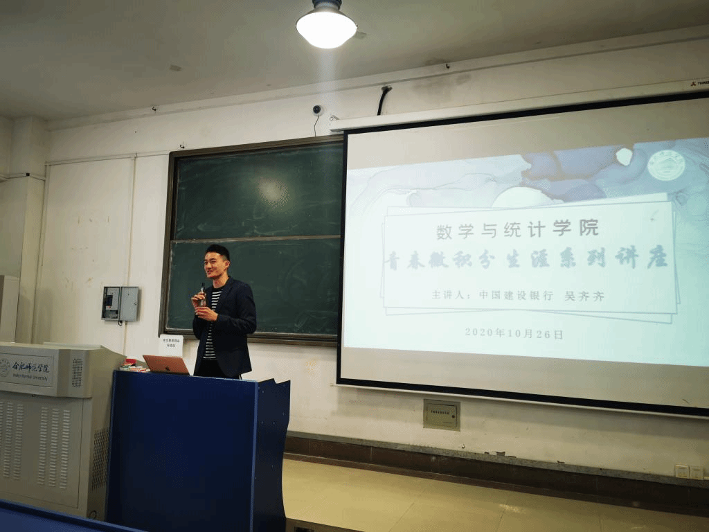 本网讯 10月26日下午,AC米兰中文官方网站在逸夫楼104举办以金融类行业求职能力提升为主题的“青春微积分”生涯主题论坛。AC米兰中文官方网站2015届经济统计学毕业生、现就职于中国建设银行合肥分行的吴奇奇应邀参加了此次活动,为即将迈向职场的2021届毕业班同学进行了金融类行业求职经验分享,该活动由2017级辅导员周倩主持,2017级金融工程班、经济统计学、应用统计学班共100余人参加此次活动。